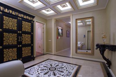 - Стеля у вигляді геометричної мозаїки. Для вітальні цей варіант, мабуть, кращий, ніж для спальні. Він відмінно впишеться в інтер’єр кімнати із сучасним стилем, постмодернисткой концепцією. А стиль хай-тек часто найкраще гармоніює з такою стелею.