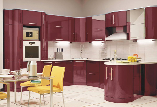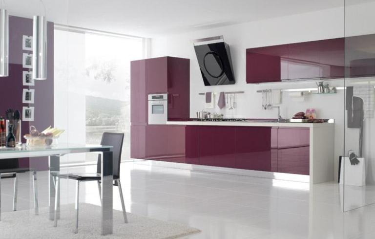 Ніжний вишневий відтінок кухонних фасадів буде гармонійно доповнений світлими, майже білими стінами і стелею. В кухонних фасадах можна сміливо додатково використовувати ручки та іншу обробку у винному кольорі. Якщо для такої комбінації підлогу оформити в чорному кольорі в дзеркальному глянці, то ваша кухня просто не зможе не викликати захват у гостей.