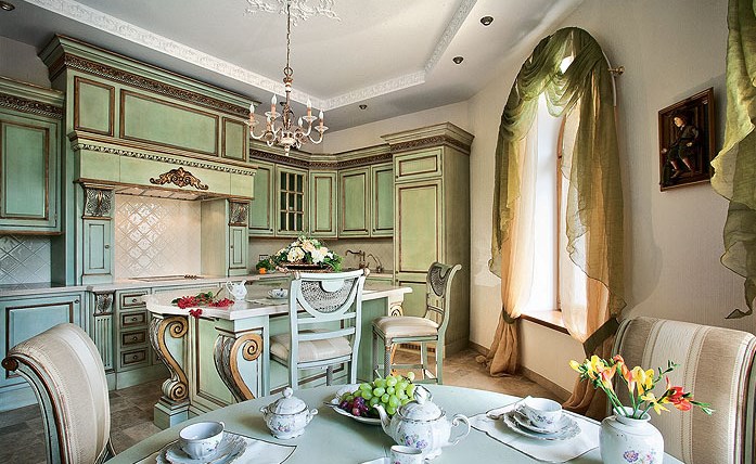 Тепер про види кухонних планування. Крім традиційних лінійної та кутової планувань, в кухнях у стилі бароко широко застосовується острівної спосіб розташування кухонних меблів.