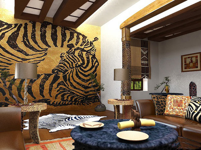 - прості форми, грубувата фактура і загальне враження «неотесаності» – в кімнаті, оформленої в африканській манері, відсутня блиск, властивий європейським інтер’єрів; в ній панує дух авантюризму та романтики;