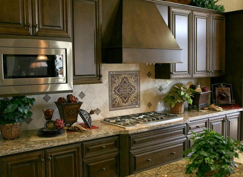 Кухонний гарнітур «іспанської» кухні має лінійну або острівну планування. Матеріал виготовлення – масив дерева темних сортів або імітує його плита МДФ.