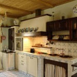 Але це не означає, що деревина – єдино можливий варіант для обробки стін «сільської» кухні. Так, кухня в сільському стилі в квартирі часто має фарбовані або оштукатурені стіни, стіни кухні прованс іноді обклеюються шпалерами з підходящим малюнком, кухня в стилі шале може мати «кам’яні» або «цегляні стіни.