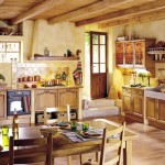 Оскільки кантрі-оформлення передбачає застосування виключно натуральних матеріалів, оптимальний спосіб обробки стелі – побілити його або ж обшити матеріалом, копирующим своєю фактурою камінь або дерево. Останнє можна зробити, наприклад, сайдингом, євровагонкою з відповідною текстурою. А ще для стелі кухні вітальні в стилі кантрі добре підійдуть дерев’яні панелі або балки.