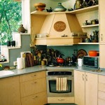 Сучасні кухонні куточки в стилі кантрі передбачають наявність місця для вбудованої техніки, однак її вони закривають стилізованими під старовину фасадами. Ну не створює сільського затишку вид посудомийної або пральної машини! А ось витяжку нікуди не приховаєш, тому про її вигляді треба подумати на етапі, коли проектується кухня з дерева в стилі кантрі. Добре б купити витяжку, що імітує камін або піч.