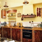 Як варіант, стіни кухні в стилі кантрі можна обробити декоративною штукатуркою або побілити, що взагалі буде не складно зробити своїми руками. А гарним акцентом виступить робоча зона, декорована кам’яною або цегляною кладкою пісочних тонів.