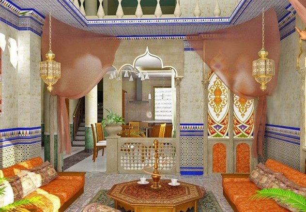 Про приналежність інтер’єру до турецького стилю говорить наявність широко низького дивана-тахти, на якому щедрою рукою розкидані пара десятків подушок. Поряд з диваном розташовуються такі ж низькі пуфи і крісла. Центр диванної композиції займає низенький – кавовий або кальянний – столик