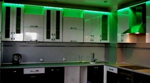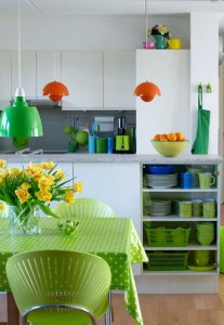 Навіть такі дрібнички як зелені життєрадісні магніти на білу холодильну камеру або мікрохвильовку, здатні поліпшити настрій. Що і говорити про більш великих предметах. Не варто недооцінювати освітлення. Зелений абажур і прихована зелена світлодіодна стрічка створять в кухні зелений напівтемрява. На тлі білої меблів така обстановка буде виглядати досить незвично.