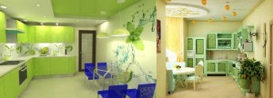 Зелений колір в інтер’єрі кухні може бути використаний на кухонному фартуху, на підлозі або на стелі. Якщо це буде стельове покриття, то не слід робити його занадто яскравим. Нехай це буде легкий відтінок зелені.