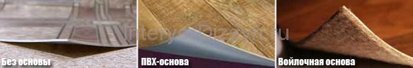 Ще одна класифікація лінолеуму підрозділяє їх на види за наявності основи. Отже, розрізняють ПВХ-покриття: