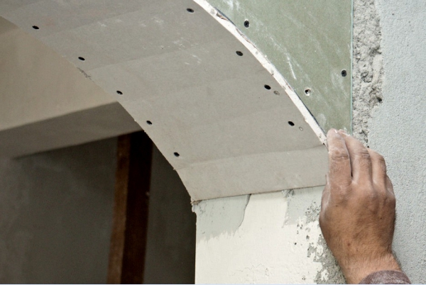 Далі проводиться установка листа і фігурного профілю. Гіпсокартонні елементи прикріпіть до напрямних профілів за допомогою саморізів по металу. Будьте обережні, так як ви можете пошкодити вирізану арку – всі рухи не повинні бути різкими. Саморізи вкручуйте на відстані один від одного на 10-12 або 15 сантиметрів. Далі встановіть вигнутий направляючий профіль. Візьміть для цього раніше підготовлений елемент, ножицями по металу зробіть надрізи по краях (по ширині), щоб він гнувся, вигніть його прикріпіть саморізами до гіпсокартонної арці зсередини. Отже, наш «скелет» арки готовий, тепер можна приступати до обшивки його торцевій частині, а саме до встановлення гнутого гіпсокартону. Для цього вам знову потрібно зробити заміри, тільки в цей раз повинна вимірюватися довжина і ширина вигнутої арки. Нанесіть розміри на гіпсокартон, виріжте отриманий шматок, з паперової боку зробіть перпендикулярні довжині надрізи до середини товщини гіпсокартонного елемента через 7-10 сантиметрів.