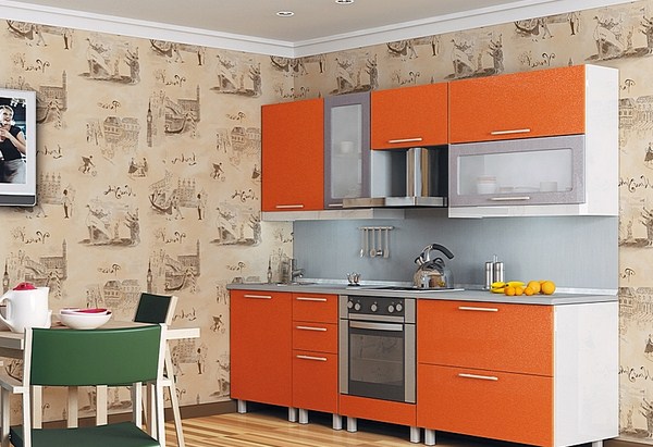 Яскрава і виділяється меблі на кухні завжди повинна бути розташована на нейтральному тлі, тому найбільш оптимально, вдало і гармонійно з помаранчевої кухнею будуть виглядати шпалери наступних кольорів: