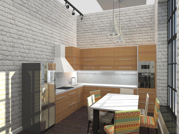Обов’язковою частиною стилю лофт є цегляна кладка, груба штукатурка і наявність труб. Якщо вам не подобаються повністю «оголені стіни», ви можете імітувати кладку за допомогою шпалер з схожим малюнком. Цегляні стіни є найулюбленішим дизайнерським прийомом у таких кухнях.