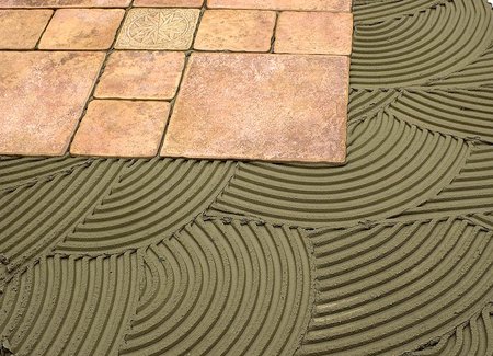 - Плитковий клей. Він продається у вигляді сухої суміші, а перед використанням розлучається чистою водою до середньої густоти. Орієнтовний витрата суміші — близько 5 кг на 1 квадрат підлоги. Отже, стандартного мішка 25 кг повинно вистачити на 5 квадратів.