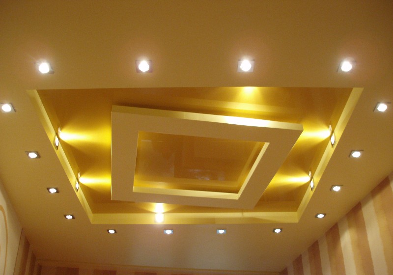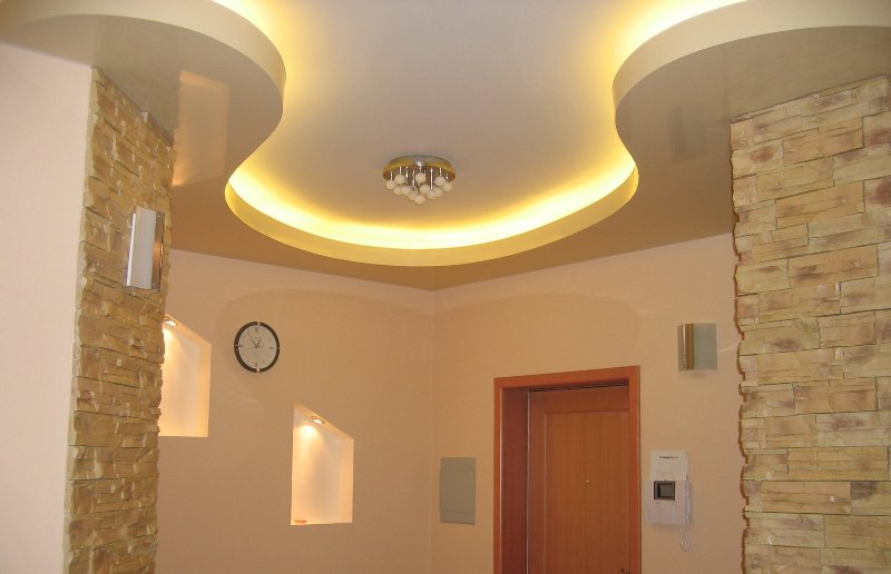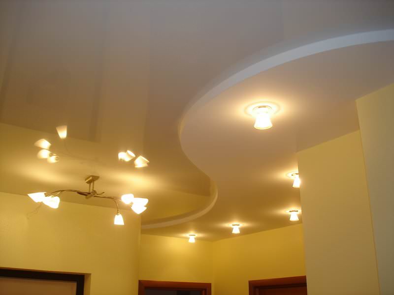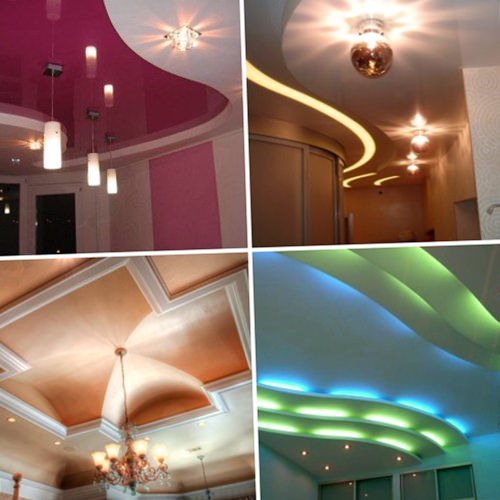 - Гіпсокартонні конструкції, безумовно, перевершують за варіантами форм натяжні аналоги. Металопрофіль дозволяє зробити стельові поверхні різної форми і складності, по суті, обмежувати цей спектр дій може тільки розмір кімнати і творча думка її власника.