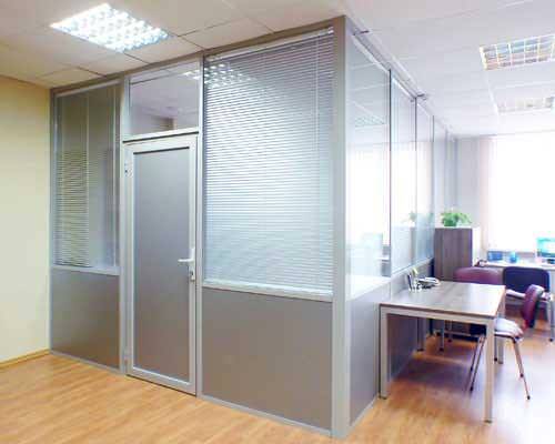 Даний вид перегородок використовується в офісних приміщеннях, де начальство часто формує на одній площі безліч робочих місць для персоналу. Монтаж збірних перегородок з алюмінію можливий для установки невеликих відділень для роботи або ж для створення повноцінних окремих кабінетів.