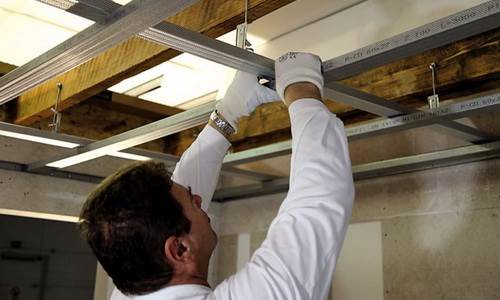 • Тепер можна приступати до установки стельового профілю. Якщо довжини профілю достатньо, то він закладається в направляючий профіль з розмітки, і закріплюється до поверхні стельового перекриття на встановлені підвіси. Тут вже слід орієнтуватися на натягнутий шнур (при з’єднанні підвісу з профілем), щоб дотримуватися задану висоту, але якщо довжина профілю не велика, достатньо буде просто закріпити його підвісами до стелі так, як він уже розташований краями в спрямовуючий профіль.