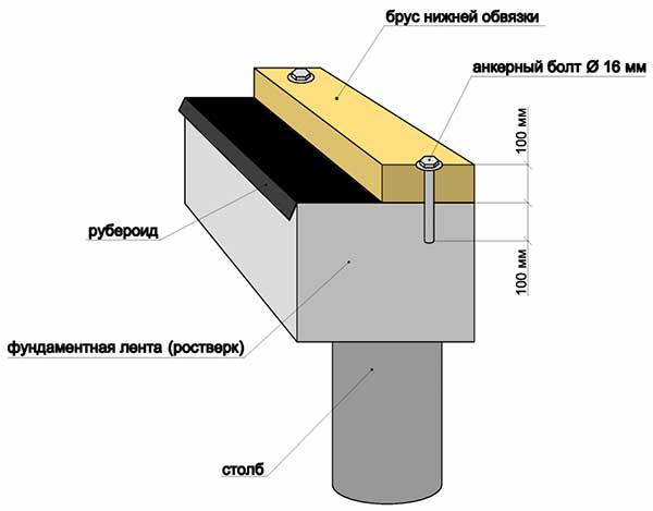 Перед монтажем нижньої обв’язки потрібно зробити гідроізоляцію фундаменту.