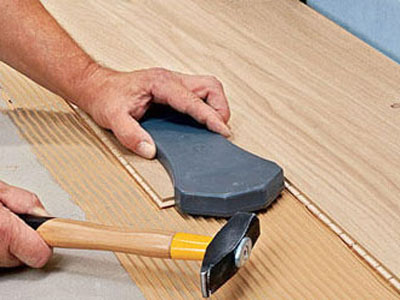 При розкрої дощок розмічайте отвору для комунікацій, які повинні бути більше діаметра труб. Починається настил від дверей. Будівельним пістолетом пробиваємо кромку першого бруса, укладаємо дошки навскоси через шипи. Капелюшки цвяхів ховаємо за наступною дошкою. Осаживаем дошки на місце за допомогою гумової киянки, при виборі зазорів користуємося важелем або клинами. Щоб не пошкодити шип, між ним і клином вставляємо обрізок дошки.