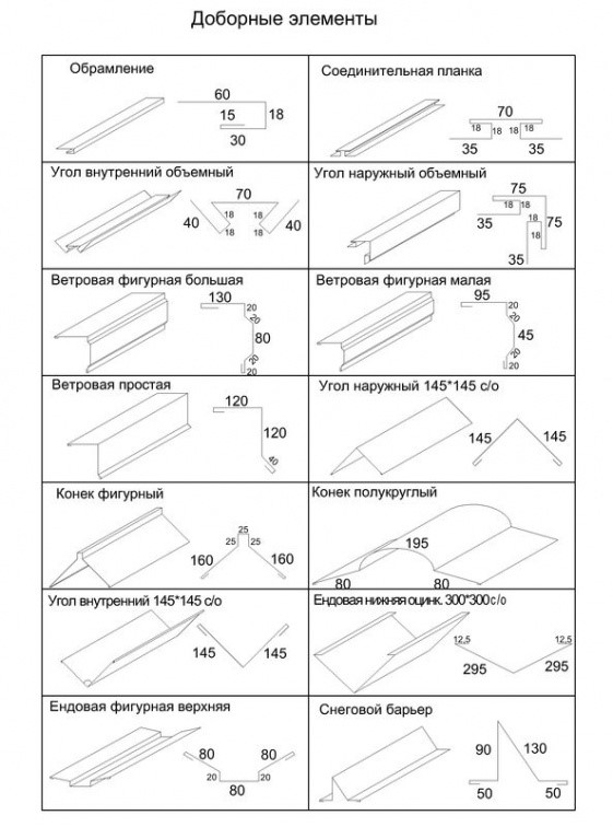 Що ж це таке взагалі? Давайте розберемося. Добірні елементи використовуються при будівництві на стиках скатів, приєднання до інших елементів, ними закриваються шви, місця зламів, вони надають даху своєрідність і оригінальність. Вони збільшують ступінь захисту, що оберігають дах від забруднення, попадання сміття, води. Без них провести монтаж покрівлі неможливо. Їх виготовляють з оцинкованої сталі, а також вони випускаються в тій же гамі кольорів, як і металочерепиця. У них всього 2 функції, які вони виконують якісно: Захист, декорування. Про них написано вище, вам не складе труднощів зрозуміти, що до чого відноситься.