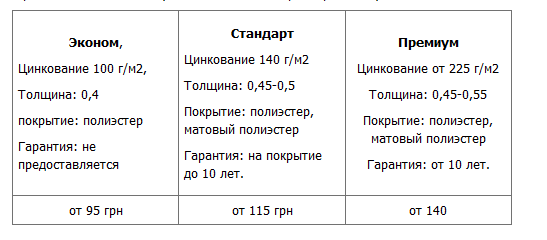 Нижче наведено фото основних параметрів та вартість металочерепиці в Росії.