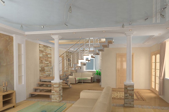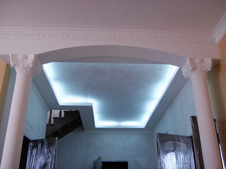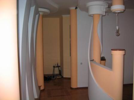 Колони з ГКЛ ідеально поєднуються з багаторівневими стелями. Круглі конструкції часто прикрашають ліпниною або рельєфною штукатуркою. Популярний дизайнерський прийом — споруда парних колон, великогабаритних приміщеннях таких дуетів може бути два або навіть три.