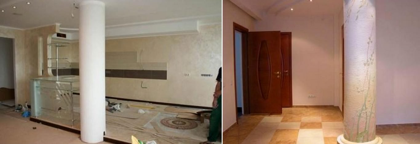 - Маскування інженерних комунікацій. Колони дозволяють вдало приховати системи вентиляції та пожежогасіння, електричний кабель, водопровідні і каналізаційні труби (особливо це стосується багатоповерхових будинків). Після завершення монтажних робіт, конструкцію можна фарбувати, обклеювати шпалерами, облицьовувати натуральним каменем або плиткою.
