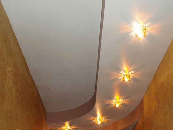 • Освітлення. Навіть найпростіший однорівневий стеля з гіпсокартону пофарбований білою вододисперсійною фарбою буде виглядати досить привабливо, якщо правильно підібрати і розмістити освітлювальні прилади на його поверхні. А при установці гіпсокартонної окантовки навколо натяжна системи в нішу можна закласти неонову або світлодіодне підсвічування, світло якої додасть поверхні чарівний перелив відтінків і візуально зробить вище висоту стін. При виборі вбудовуваних світильників рекомендується звертати свою увагу на дизайн незвичайних освітлювальних приладів. Адже часто саме вони є єдиним художнім елементом стельової декорації.