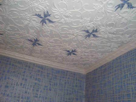 • Обклеювання шпалерами, також досить часто застосовується для декорування стелі у вищезазначеному приміщенні. Сучасні виробники шпалер пропонують різноманітні типи подібних облицювальних матеріалів, які дозволяють підкреслити загальну інтер’єрну задумку.