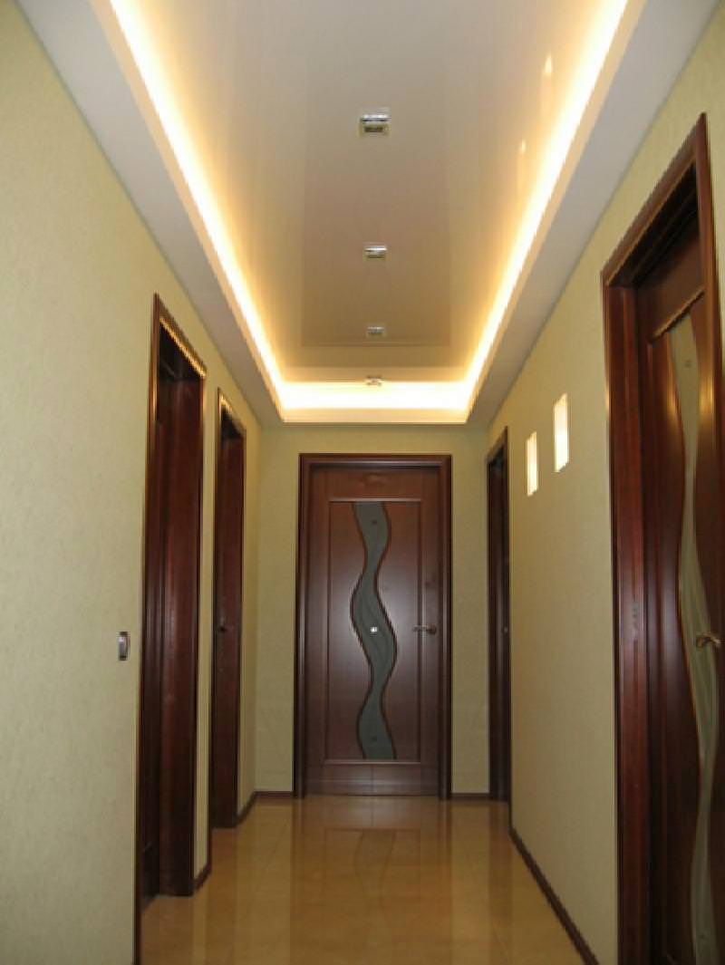• Натяжні стельові системи виглядають досить сучасно. Передпокій з такою стелею буде здаватися більш просторою. Дуже цікаво виглядають підвісні конструкції, полотна яких встановлюється неонове освітлення. Для додання дизайнерської виразності можна встановити полотно з нанесеним візерунком фотопечатным способом, наприклад, із зображенням фрагмента небосхилу, проте своїми руками таку конструкції змонтувати дуже складно.