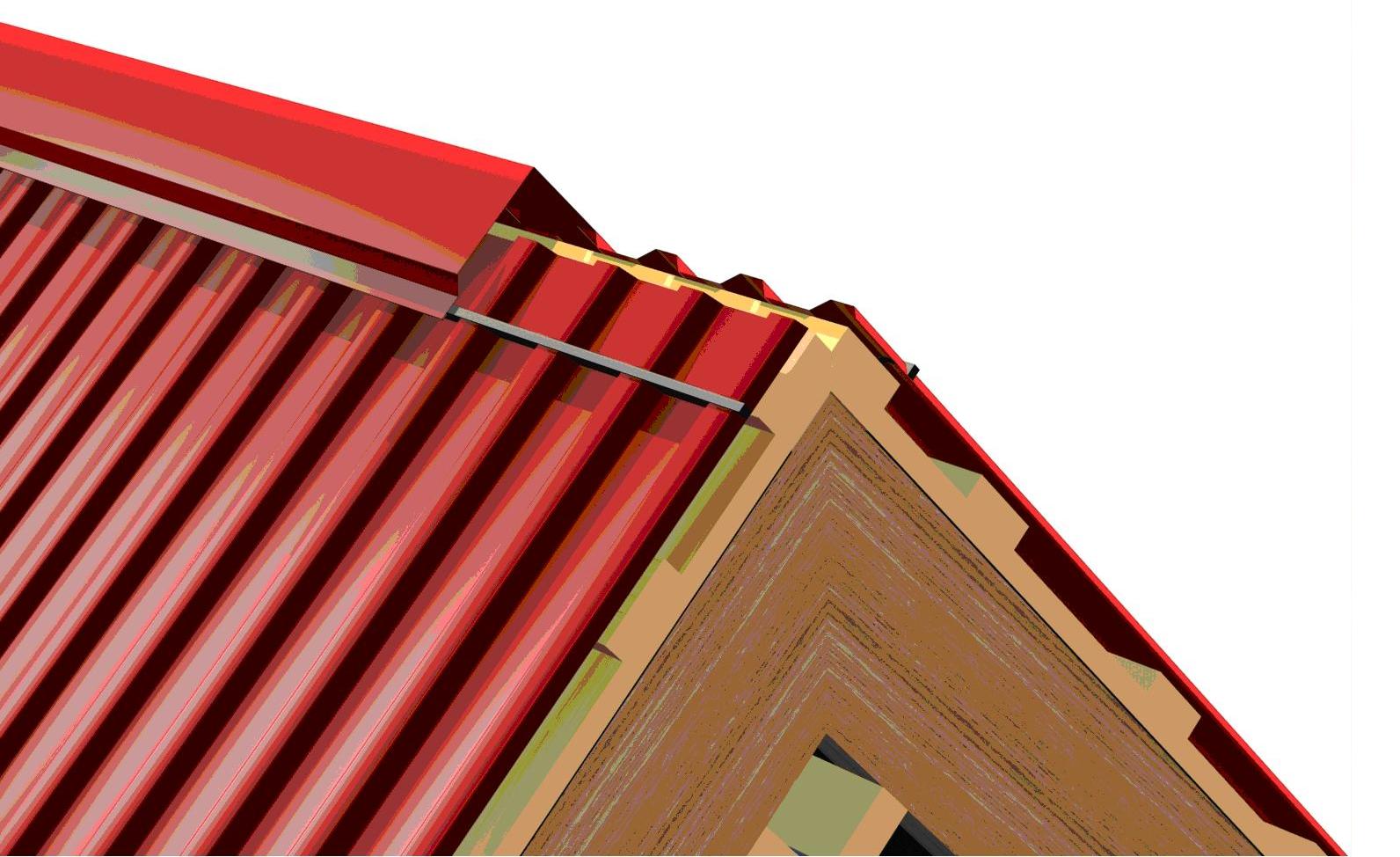 З торців необхідно встановити фронтони з нахлестом близько 10 см, а крок між саморізами повинен бути не більше 30 см. Коник також повинен мати нахлест, а саморізи загвинчуються не внизу хвилі, а в її гребінь. Так як коник — проблемне місце, між ним і листом профнастилу укладається ущільнювач, і залишається зазор для вентиляції. Аналогічно встановлюється і пристінний профіль. На кожні 3м2 покрівлі знадобиться приблизно 10 саморізів, незалежно від того, який ухил вона має.