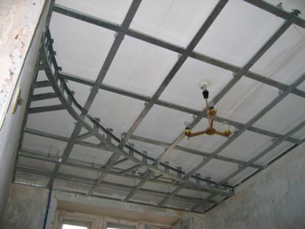Каркас для стельової конструкції має вигляд сітки, яку формують несучі профілі cd, закріплені на стінах з допомогою направляючих ud і на стелі П-образними кронштейнами або быстроподвесом.