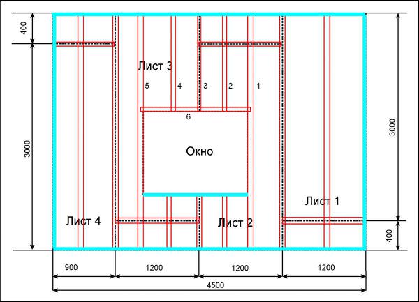 Порівняно з технологією виготовлення стельового каркаса підстава для стіни з гіпсокартону виготовити простіше. Вертикальні несучі профілі встановлюють з кроком 600 мм по центру. Два розміщують по краях гіпсокартонного листа і третій посередині.