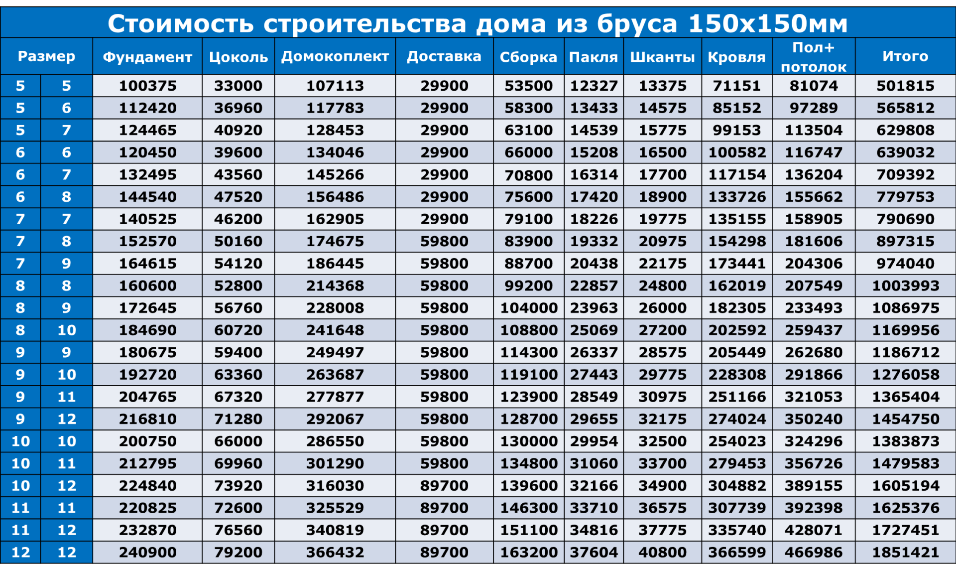 Порівняльна характеристика вартості будинків з бруса, в залежності від їх розміру