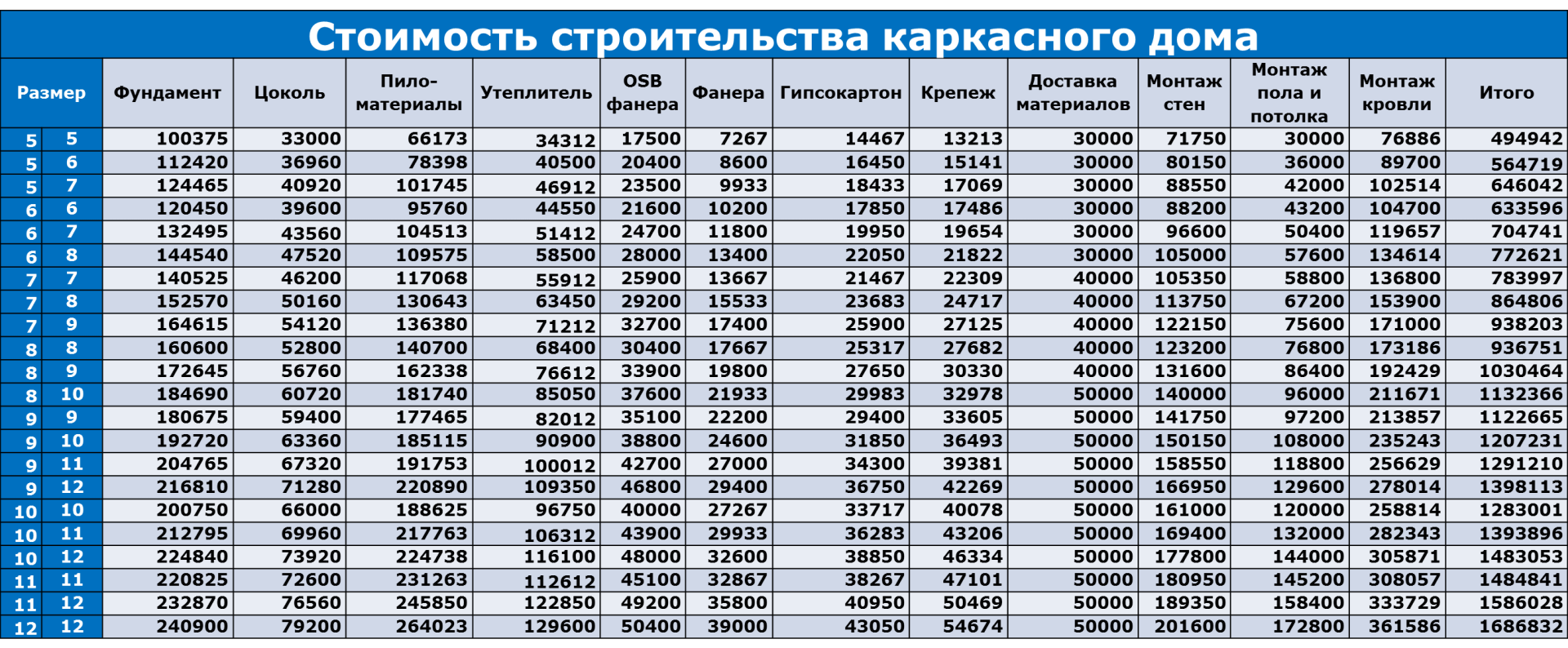Порівняльна характеристика каркасних будинків по їх вартості, в залежності від розміру