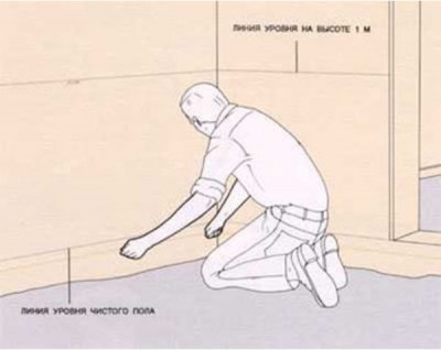 Рівень бетонної підлоги виставляємо в «нуль» з низом дверного отвору і наносимо по всьому периметру приміщення. Щоб це зробити, необхідно поставити позначку на стіні на рівні 1 м від низу дверного отвору. Потім перенести мітки на стіни по всьому периметру приміщення і вже від них відміряти і намітити назад 1 м вниз. Отримана лінія і буде «нульовим» рівнем, до якого необхідно залити бетон. Щоб легше орієнтуватися, по цій лінії в кутах кімнати можна забити цвяхи і натягнути на них шнур.