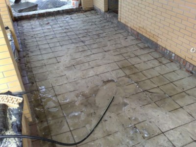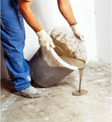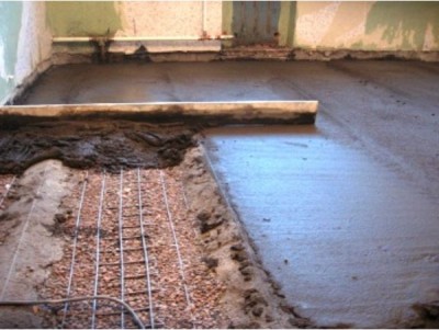Щоб приготувати бетон, беремо 1 частина цементу, 2 частини піску, 4 частини щебеню і 0,5 частини води. Перемішуємо в бетономішалці і отриману суміш використовуємо для заливки підлоги. Заливати починаємо з протилежного кута від дверей. Необхідно за один-два рази залити кілька «карт», після чого лопатою розрівняти і розтягнути суміш. Для щільної усадки бетону використовуємо спеціальний вібратор, який сприяє ущільненню бетону і заповнення ним усіх порожнин.