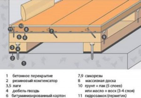 Конструкція дощатої підлоги по бетонній основі з опорами з лаг по своїй конструкції нічим не відрізняється від дерев’яної підлоги по грунту. Основною відмінністю є товщина самих лад. Якщо для підлог по грунту доводиться вибирати більш товстий брус 100*100 мм, то для дощатої підлоги по бетону можна брати більш тонкий — 50*50 мм В додаток до цього, для дощатої підлоги по бетону необхідно створювати пароізоляційний шар, який укладається під лаги чи фанеру. Конструкція дощатої підлоги по грунту і по бетонній основі повинна бути на відстані 2-3 см від стін. Це створить вентильований простір і зберігає підлогу від вогкості. Щоб приховати цей зазор, поверх дощатого настилу прибиваємо плінтус.
