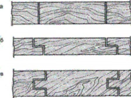 а) — «впритул», б) — «в чверть», в) — «шпунт». Найпоширеніші типи і способи укладання дощатого настилу
