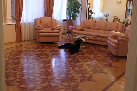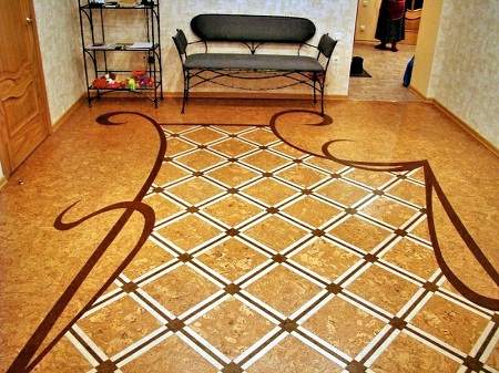 Коркове покриття для підлоги фото якого ви можете бачити трохи вище, виконане в класичному стилі з елементами комбінування відтінків. У центрі кімнати дизайнер за допомогою темно-коричневою і вибіленої пробки створив ділянку «фальшивої» керамічної плитки, прикрасивши його краю тонкими смугами, що додають інтер’єру романтизм. Ідеальне рішення для просторих приміщень.