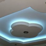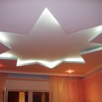 - Один з рівнів стелі можна виконати як у вигляді простої геометричної фігури, так і фантазійного візерунка. При цьому опуклою частиною стелі може виступати як центральна його частина, так і «фонова».