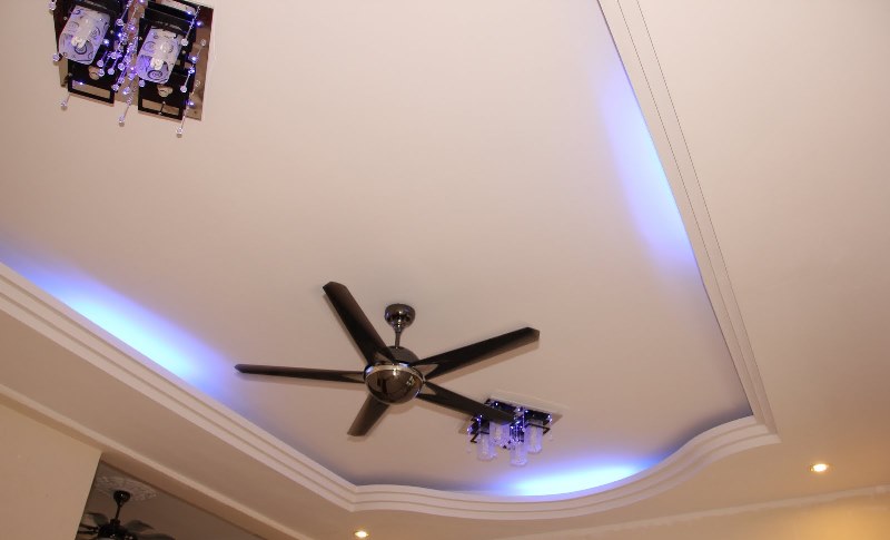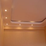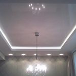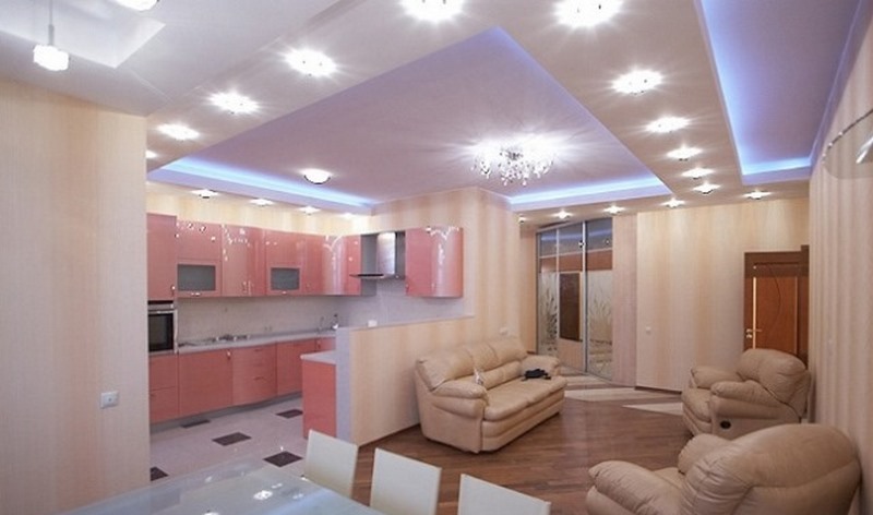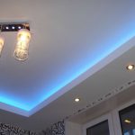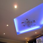 - При наявності дворівневого стелі з’являється можливість використовувати декілька видів освітлення: від яскравого вечірнього до ненав’язливого нічного. Додаткове освітлення може розташовуватися як по всьому периметру конструкції, так і точково. Крім того, багато дизайнерів використовують підсвічування різних кольорів, підкреслюючи тим самим стиль інтер’єру.