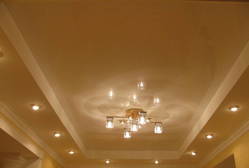 Порядок складання такої стелі – спочатку каркас і гкл другого рівня з усіма комунікаціями та освітлювальними приладами, а потім – багет з натяжною стелею.