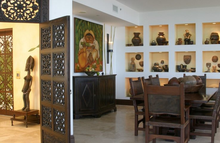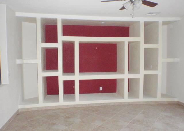 Такі полки вбудовують в ніші – природні або зроблені. При цьому вся ніша може бути також зроблена з гіпсокартону. Вбудовані полиці доречні в приміщеннях будь-якого призначення.