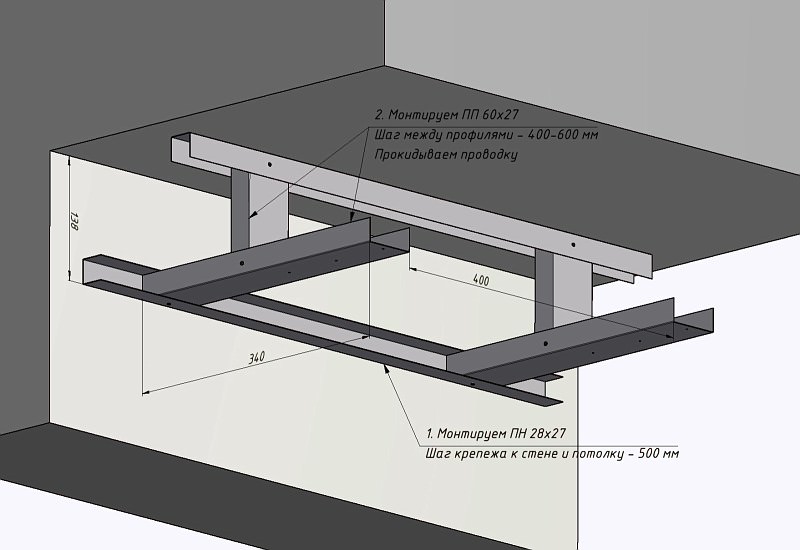 Після цього на стіні розмічаються отвори під полицю і висвердлюються. На стіни вішається профіль, встановлюються направляючі і кріпиться конструкція з гіпсокартону.