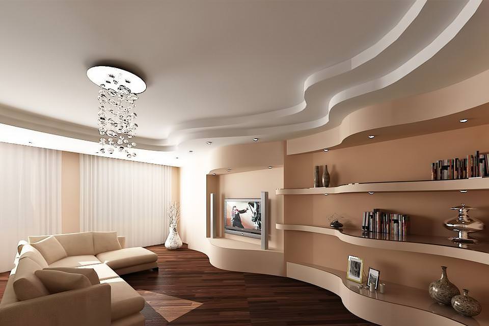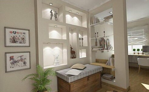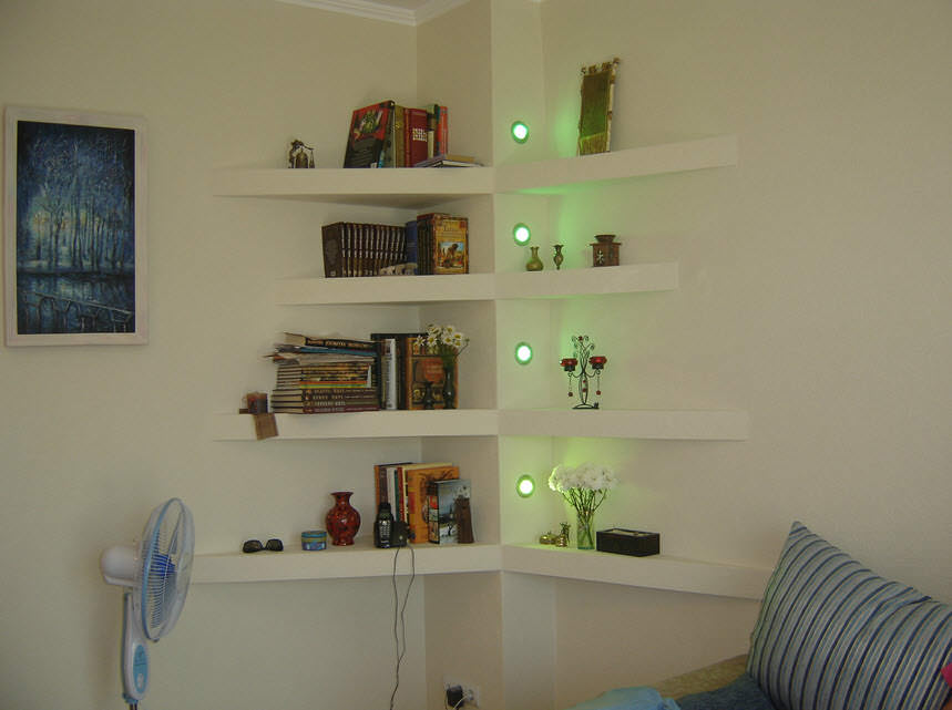 Якщо в кімнаті є готові ніші, то дуже важко буває їх обіграти – часто в інтер’єрі вони стають мертвою зоною. У цьому випадку в такій ніші вигідно розмістити прямі полиці з матеріалу гіпсокартону. Взагалі полички з сучасного гіпсокартону хороші тим, що з легкістю можуть бути врізані в будь-яку з конфігурації нішу.