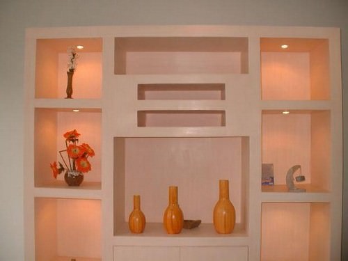 Такі полки вбудовують в ніші – природні або зроблені. При цьому вся ніша може бути також зроблена з гіпсокартону. Вбудовані полиці доречні в приміщеннях будь-якого призначення.