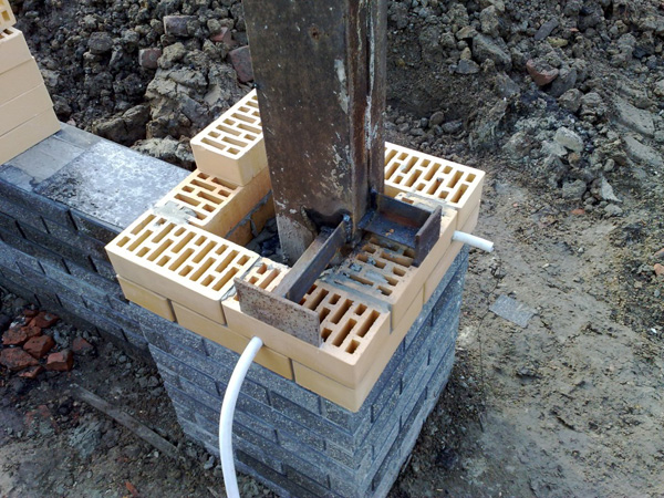 Установку опорних стійок варто виконати в першу чергу. У разі використання труби з металу, потрібно підвищити рівень стійкості майбутньої конструкції, приваривши знизу п’яту розмірами 20х20 см і 2 куточка, які варто поєднати перпендикулярно.