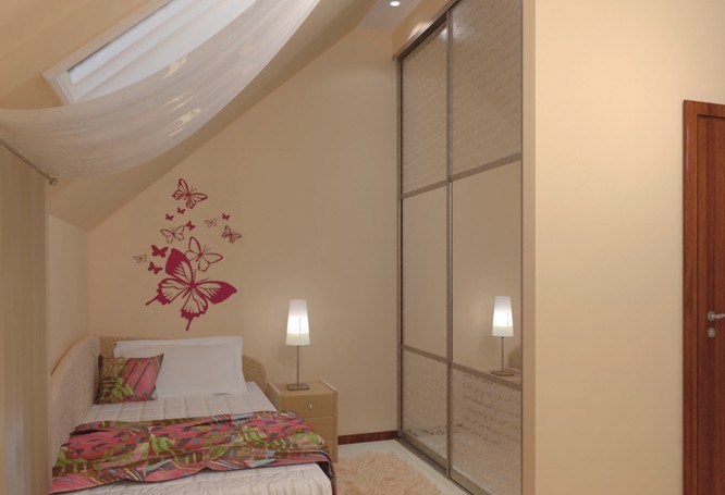 Кутовий шафа зазвичай встановлюють в квадратній кімнаті або ж кімнаті з кутовою нішею. Дана конструкція не захаращує простір, зовні виглядає цікавіше, ніж прямолінійна. А якщо ви вирішите обладнати даний шафа дзеркальними дверима, розмір кімнати за рахунок цього візуально збільшиться.