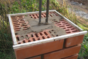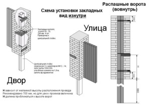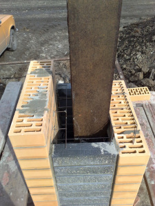 Після по всьому периметру стовпа на цементно-піщаний розчин викладаються цеглини з періодичною перев’язкою швів. Всередину засипають гальку, яка заливається розчином. Серцевину стовпа можна забетонувати, а цеглу в таких випадках відіграють роль опалубки. Всі ці дії потрібно зробити при зведенні кожного ряду кладки. У трьох нижніх рядах стіни воріт краще використовувати повнотіла цегла, тоді як в інших рядах можна застосовувати і пустотіла, однак з таким видом цегли не потрібно брати занадто рідкий розчин, так як він буде проникати, і вивалюватися з щілин цегли. Набагато швидше і зручніше буде протікати робочий процес, якщо розчин класти відразу під всі цеглини.