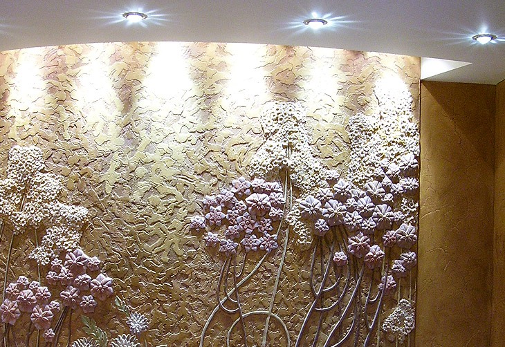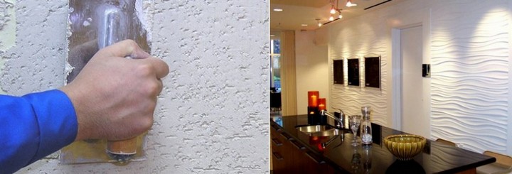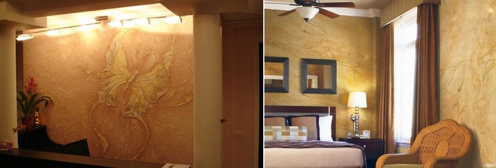 За допомогою гладкої штукатурки можна виконати шовкову драпіровку, брижі на воді, перлову раковину, легку морську піну. Штукатурка дає можливість створити неповторні малюнки, подібні фото. Знадобитися тільки кельма.
